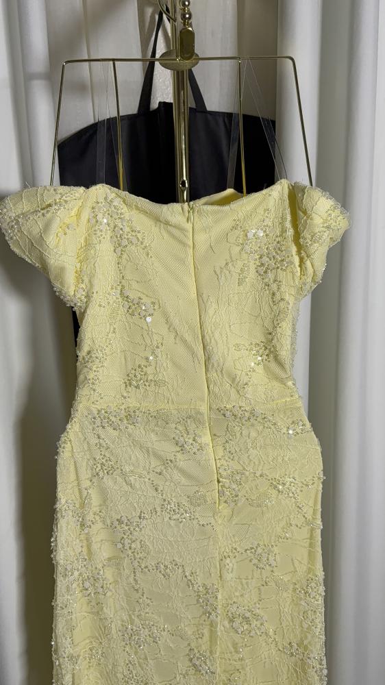 فستان سهره ليموني مع بطانه مطرز كم شولدر سحاب بالخلف
