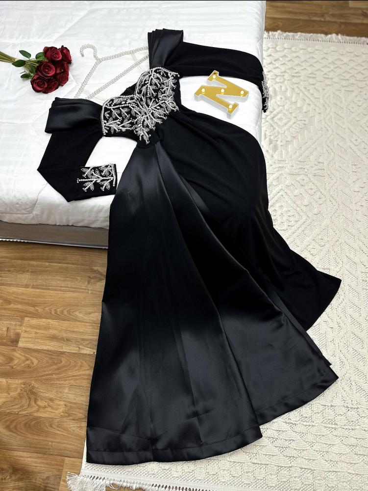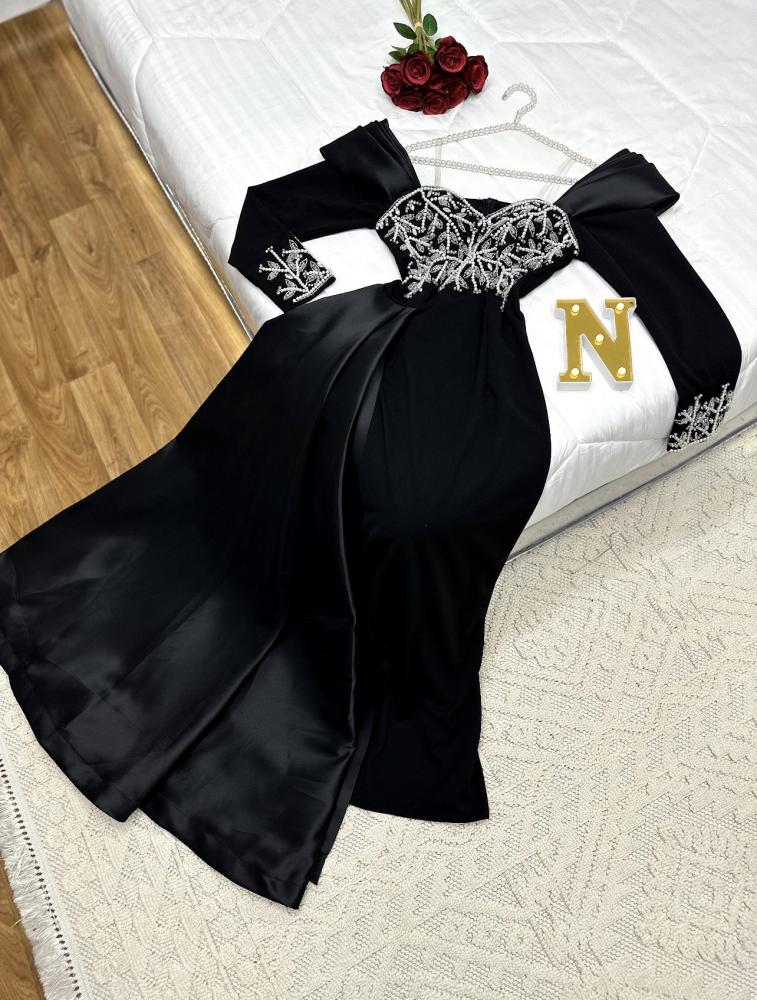 هذا الفستان الأسود الطويل يتميز بأناقة لا مثيل لها، فهو يحتوي على أكمام طويلة تمنح الإطلالة طابعاً أنيقاً وأنثوياً، ويتميز بفص على الصدر يضفي لمسة جذابة ومميزة، كما تتواجد عطفات على الكتف تزيد من جمالية التصميم وتضفي لمسة أنيقة على الإطلالة بشكل عام.