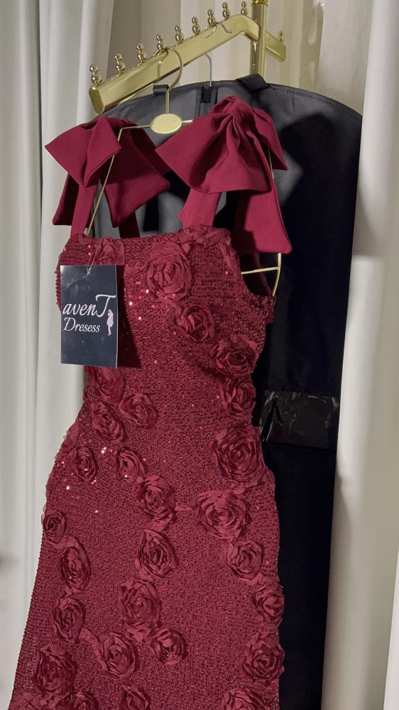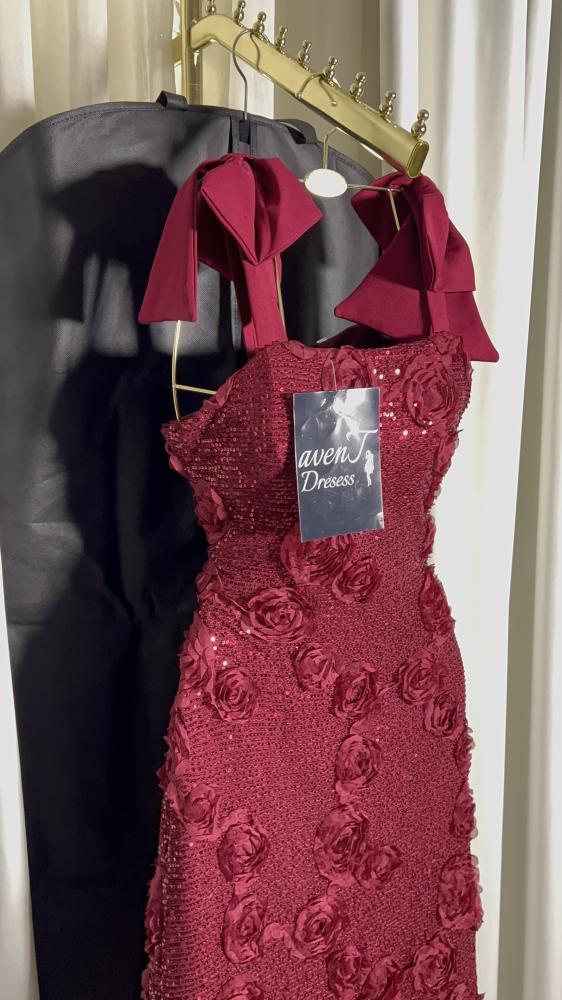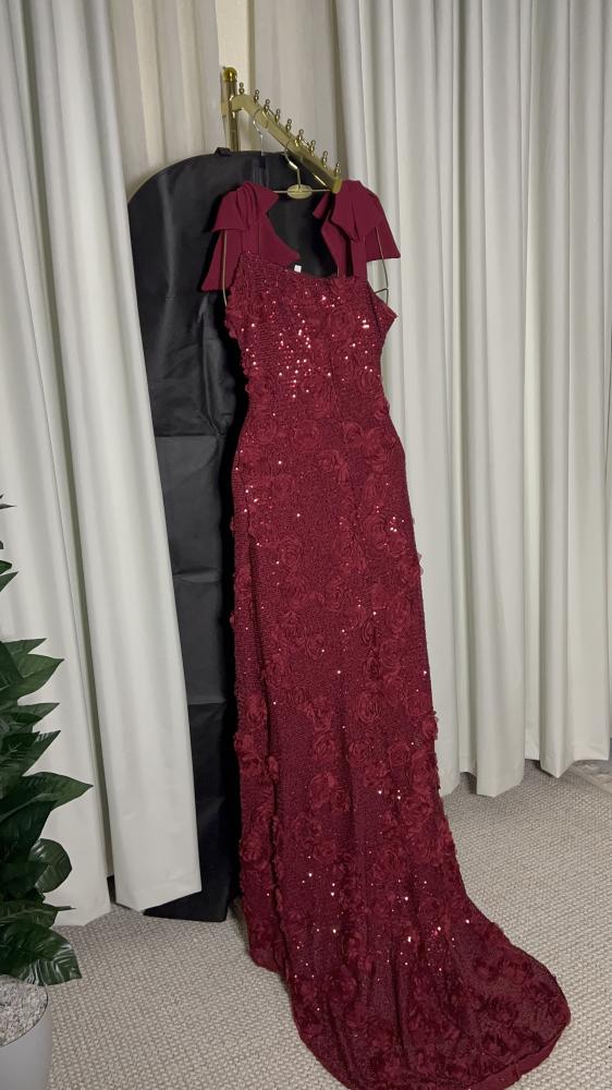 فستان ساحر مصنوع من قماش ترتر لامع بلون البرغندي ، يعكس الضوء بنعومة ويمنح إطلالة أنيقة وراقية. التصميم خالٍ من الأكمام، بفتحة صدر ناعمة تأخذ شكل القلب أو مستطيلة قليلاً، ما يبرز الكتفين ويضفي لمسة أنثوية رقيقة.