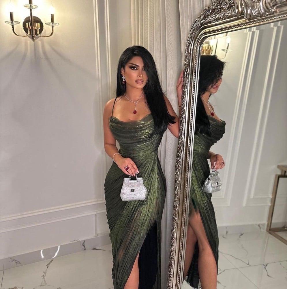 فستان زيتوني انيق خامه كرنكل راقي ناعم شبيه حرير على شيفون