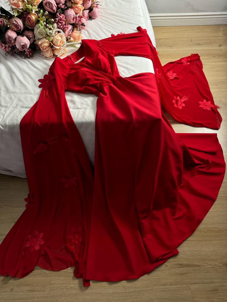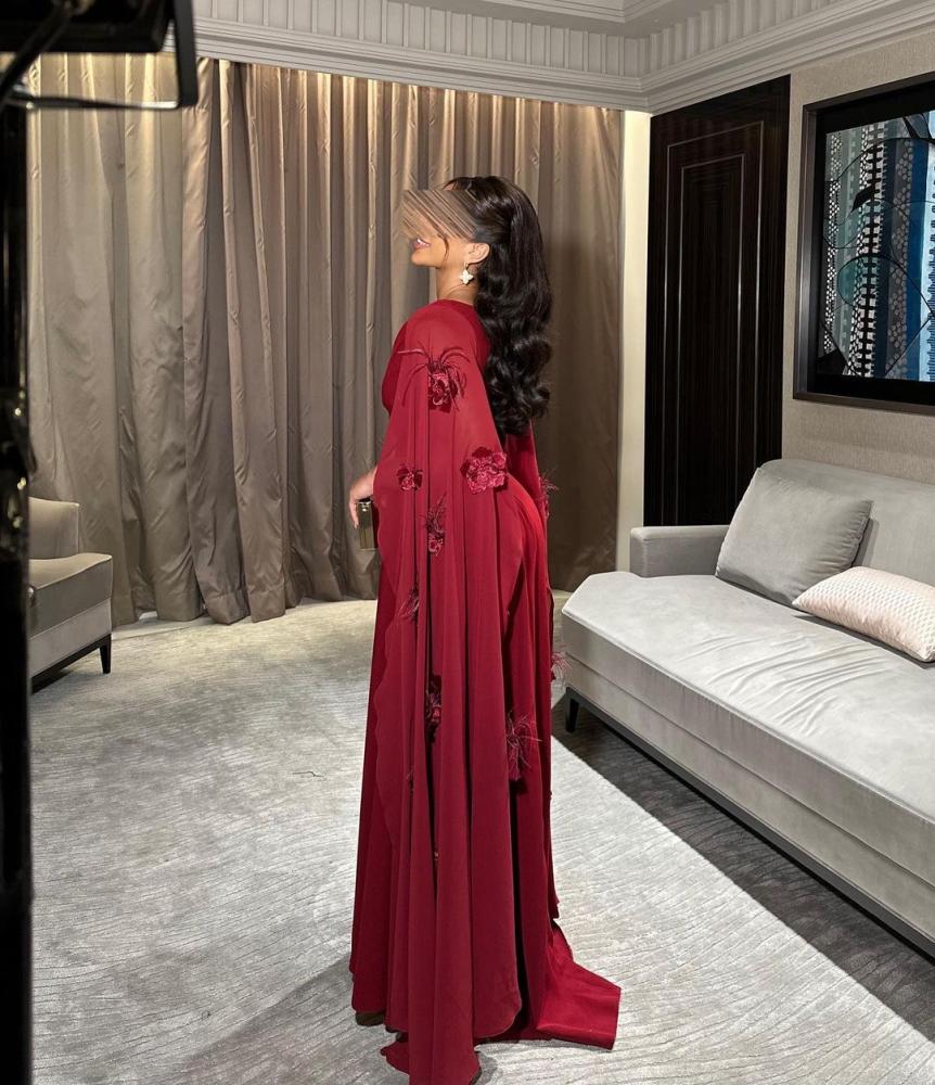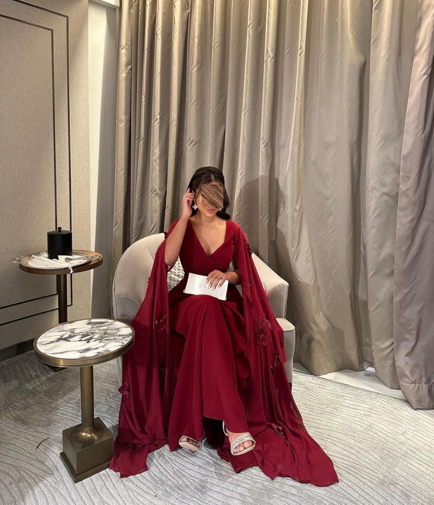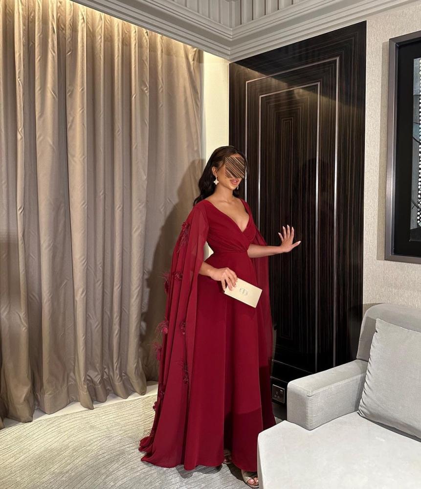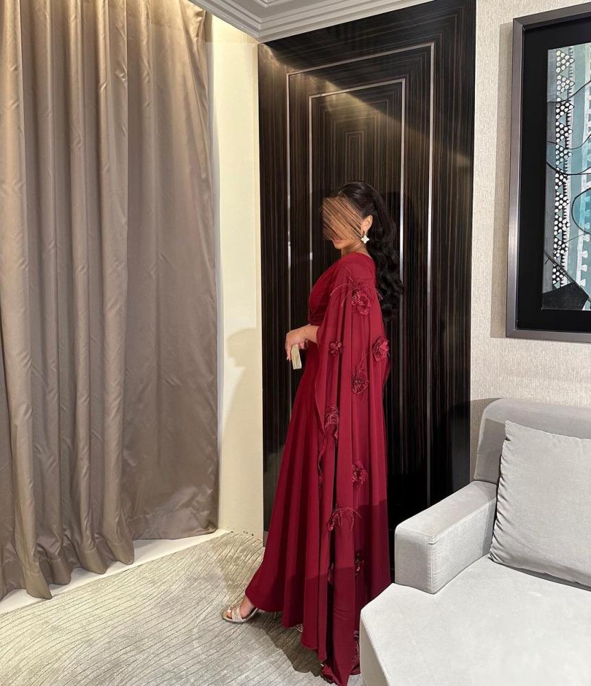 فستان عنابي ناري بخامه تفته مطفي راقي أضافه إلى كم شيفون ناعم و ورد مع ريش