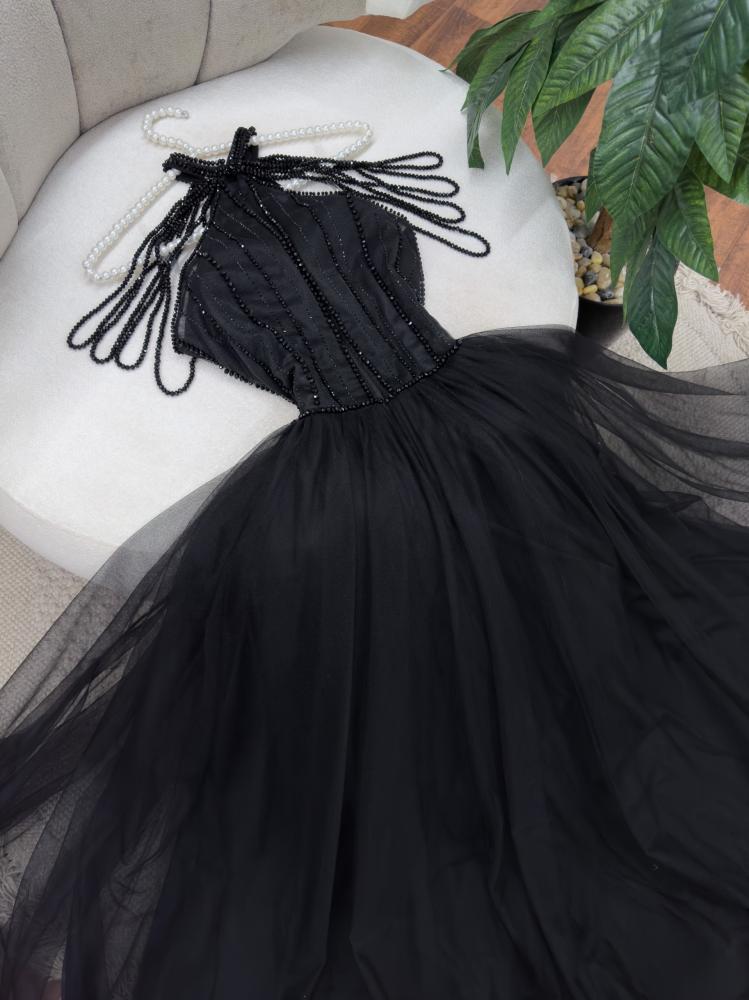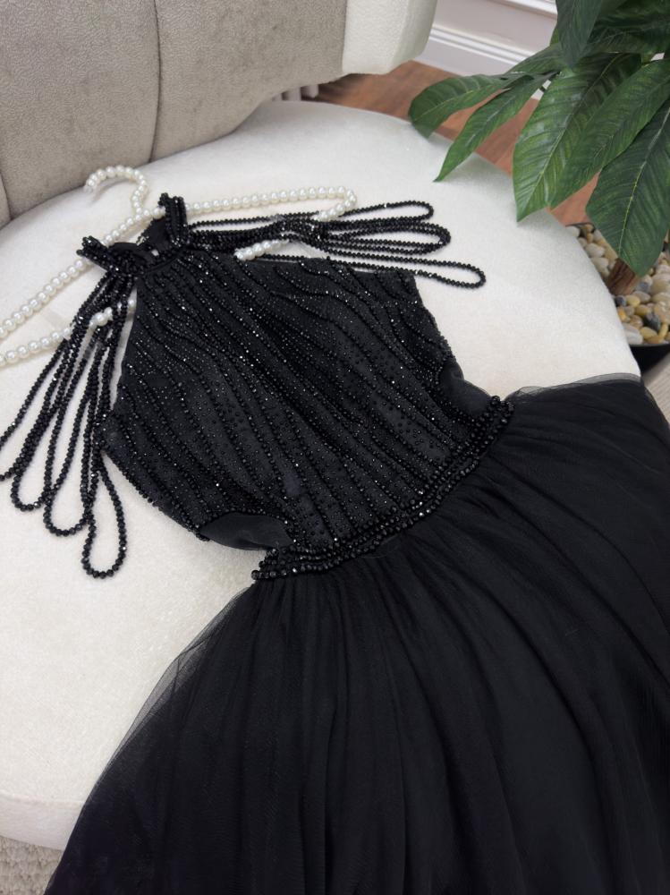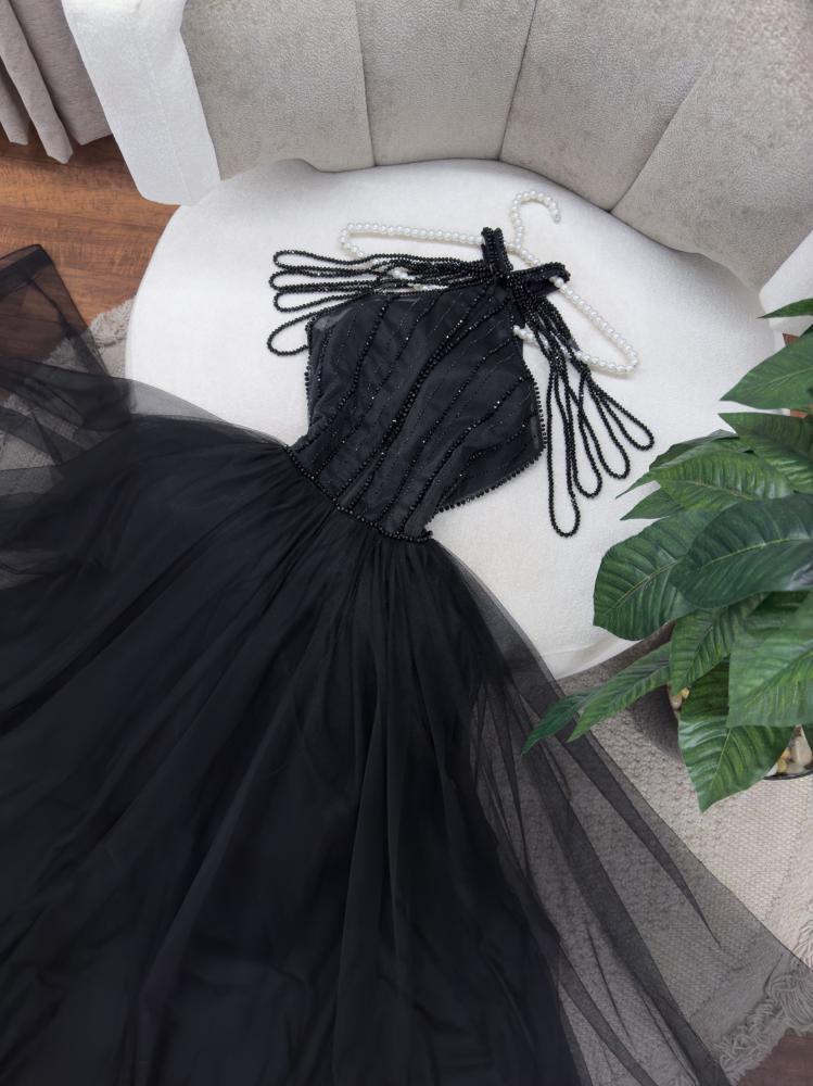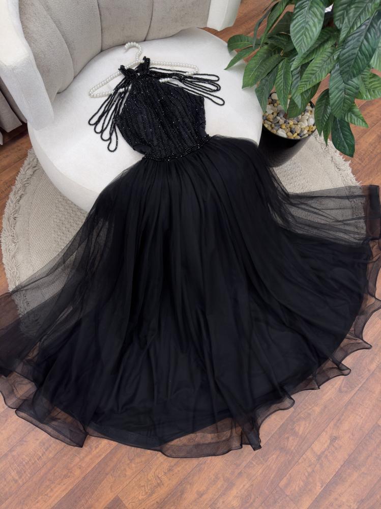 فستان انيق باللون الاسود خامه تل تطريز راقي الاصلي وخرز شقل يد